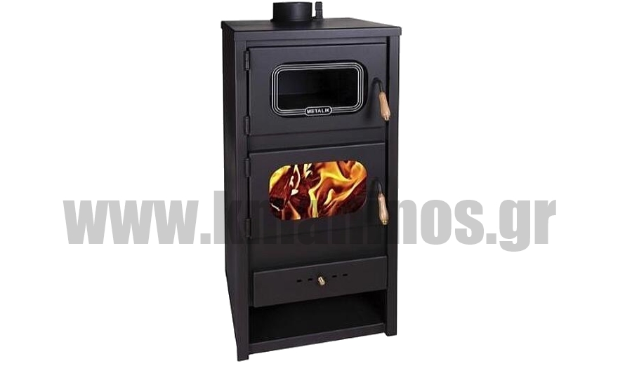 Σόμπα ξύλου με εστία μαγειρέματος, φούρνο και αποθηκευτικό χώρο για ξύλα στο κάτω μέρος.