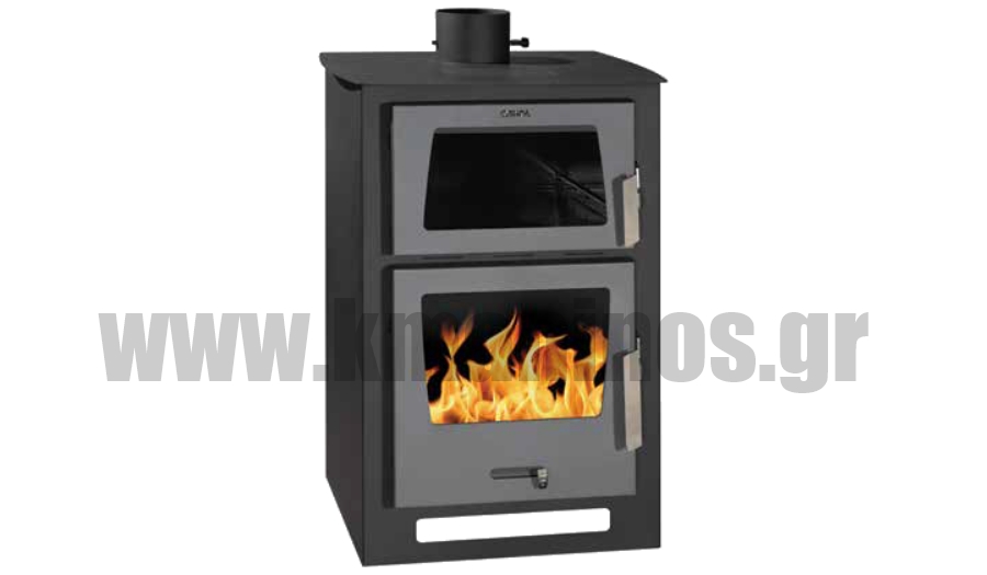 Σόμπα ξύλου με φούρνο από χάλυβα με μεγάλο χώρο καύσης επενδυμένο με βερμικουλίτη.