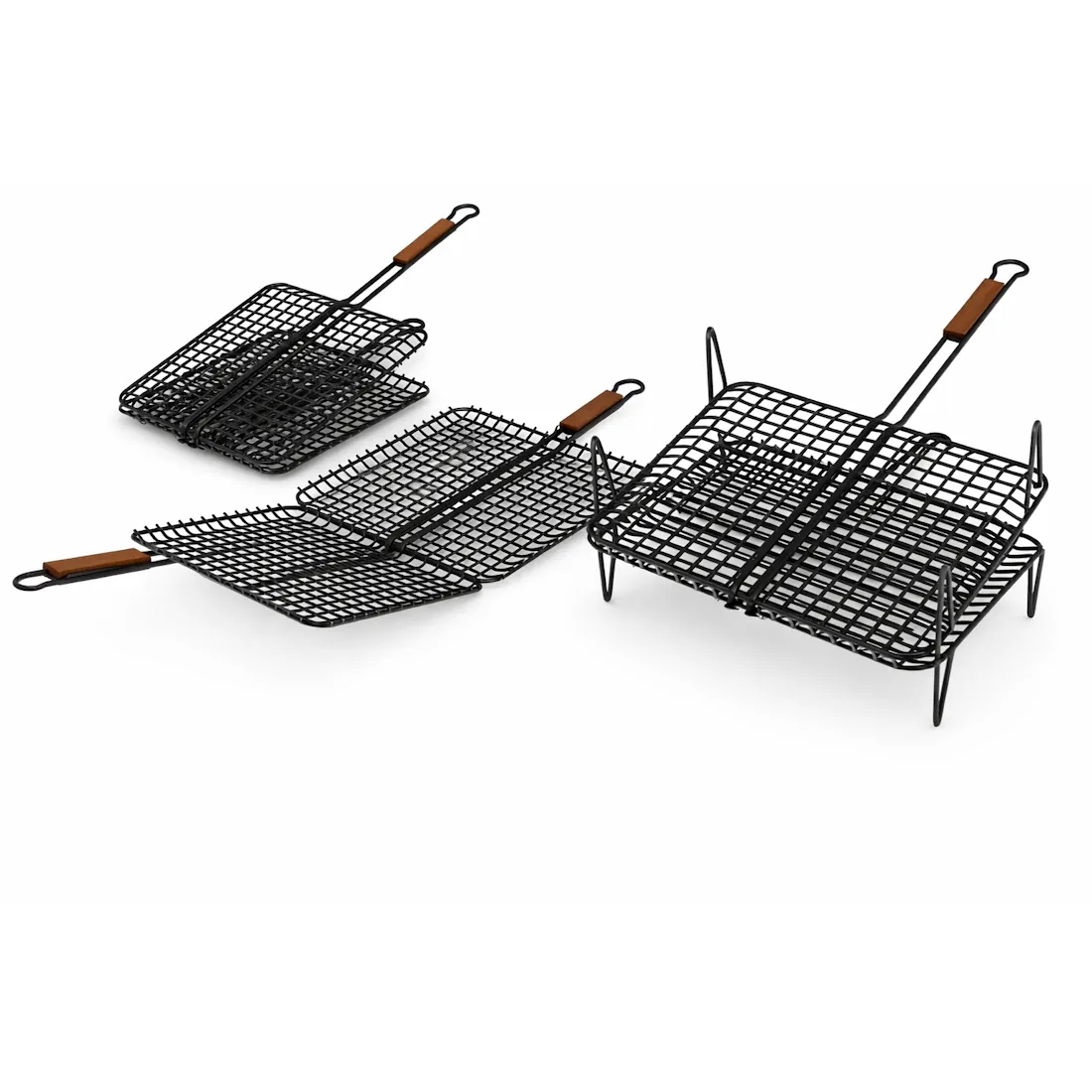 Σχάρες ψησίματος αντικολλητικές (βουτηγμένες σε εμαγιέ μαύρη βαφή τεφάλ), καρέ, φουσκωτές με ξύλινη λαβή.