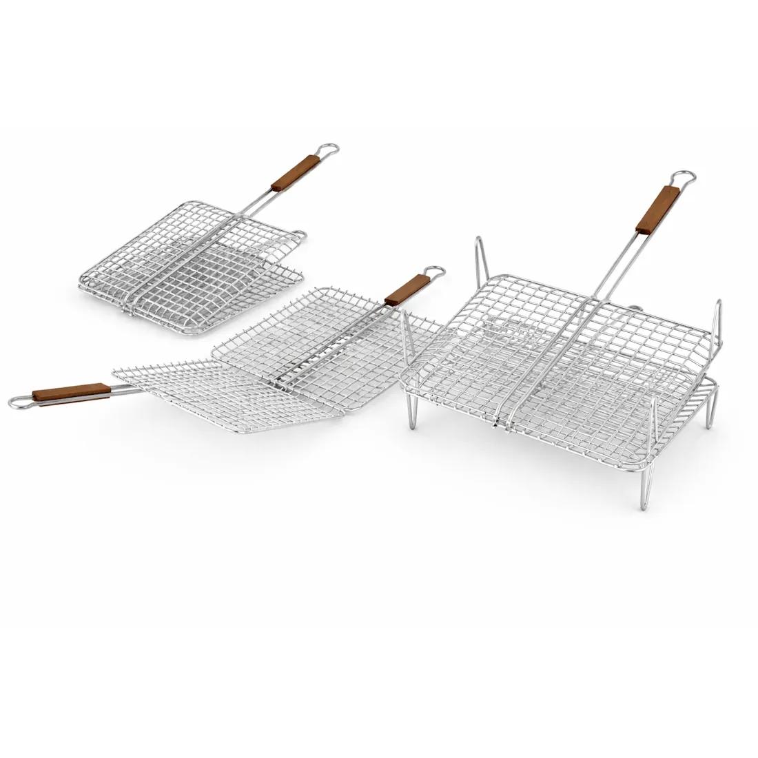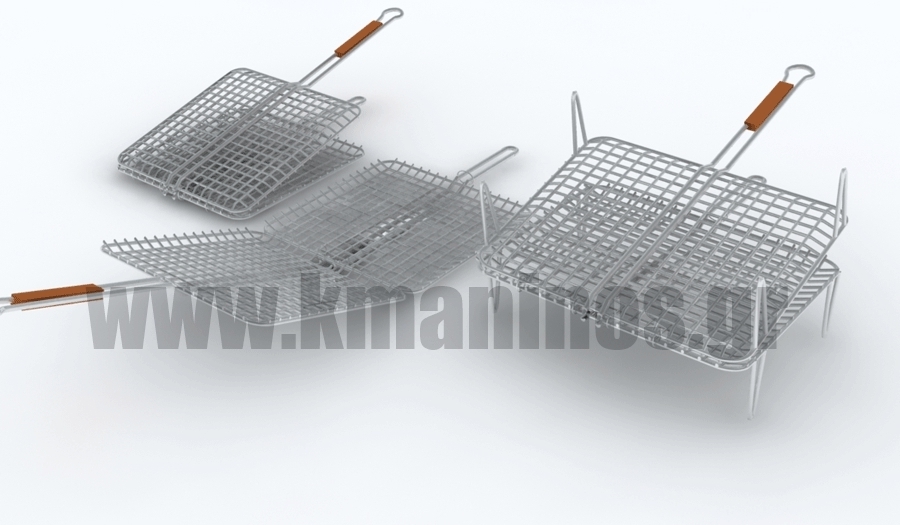 Σχάρες ψησίματος χρωμίου, καρέ, φουσκωτές σαν καλάθι με ξύλινη λαβή ιδανικές για μικρούς μεζέδες όπως παϊδάκια ή μικρά ψάρια (σαρδέλα).