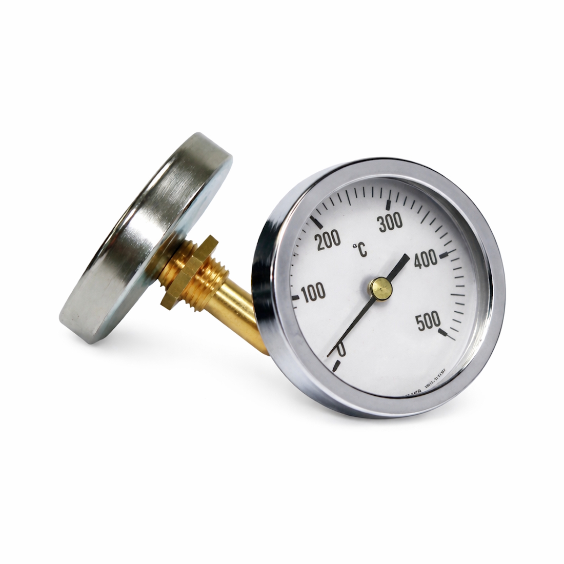 Η ένδειξη του βιδωτού θερμόμετρου για ξυλόφουρνους δείχνει έως 500°C.